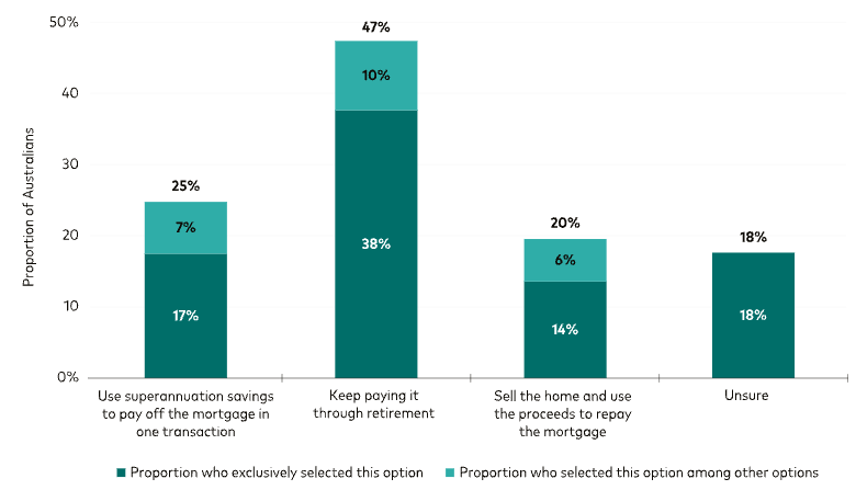 When working-age Australians were asked how they will manage their mortgages during retirement, nearly half (47%) said they expect to continue making payments during retirement.